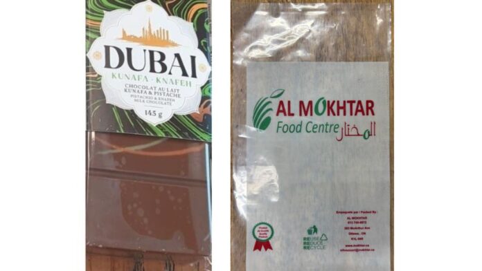 A recall was issued earlier this week for Dubai brand Pistachio & Knafeh Milk Chocolate due to possible salmonella contamination. The product was distributed in Quebec and sold online. Â