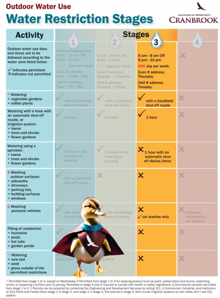 The City of Cranbrook will move to Stage 3 watering restrictions on Saturday, Oct. 4, limiting residents to outdoor watering one day a week until further notice.
